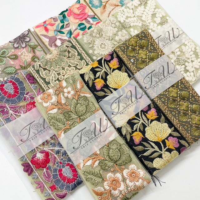 【数量限定】ピンク~グリーン系インド刺繍リボンセット1(50cmカット10本入り)