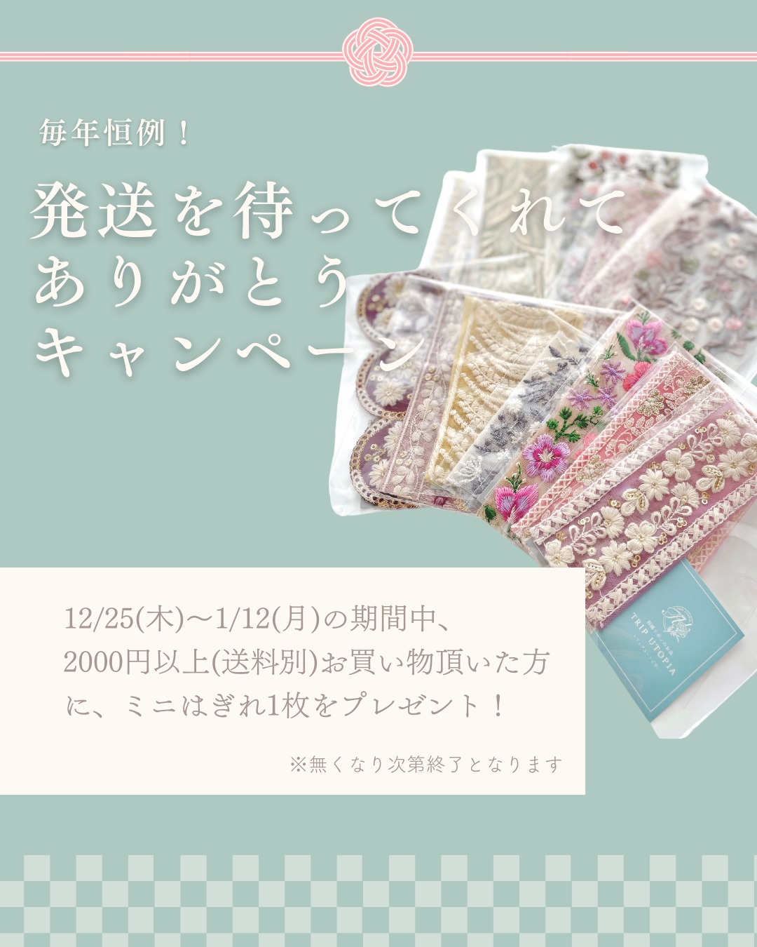 12/25~1/12の期間中、2000円以上(送料別)お買い物頂いた方に、ミニはぎれ1枚をプレゼントいたします。