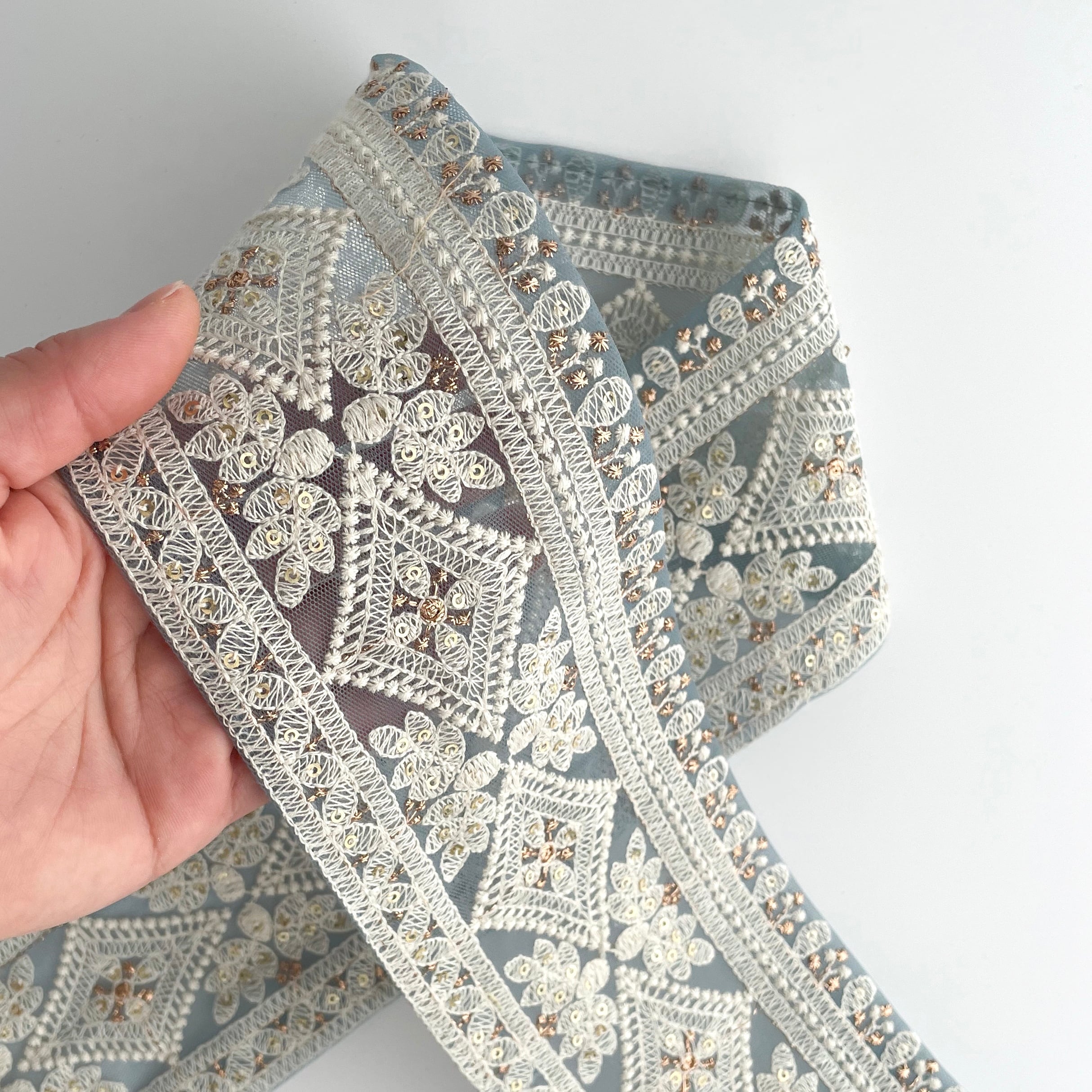 このような豪華な刺繍のリボンをインドでは「サリーボーダー」「アショカレース」と呼び、民族衣装サリーの裾を飾るのに使用しています。