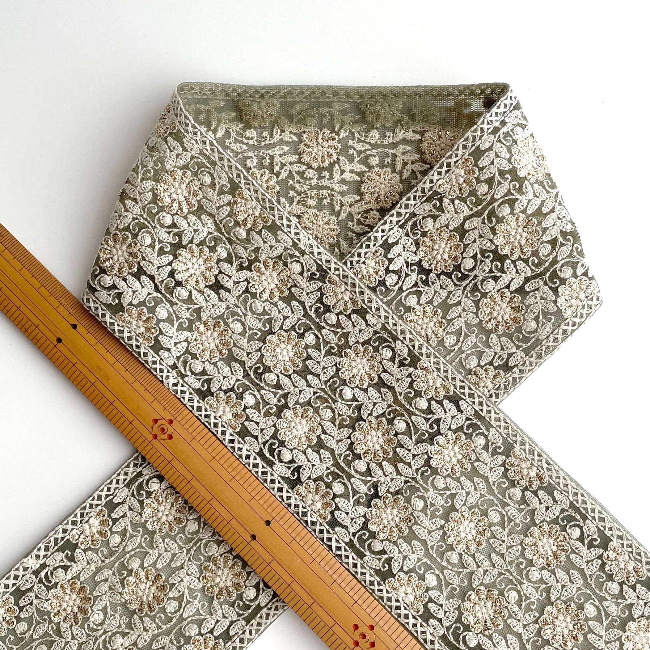 【50cmカット済】ins0689 チュール白糸×金糸マム太 グリーン インド刺繍リボン