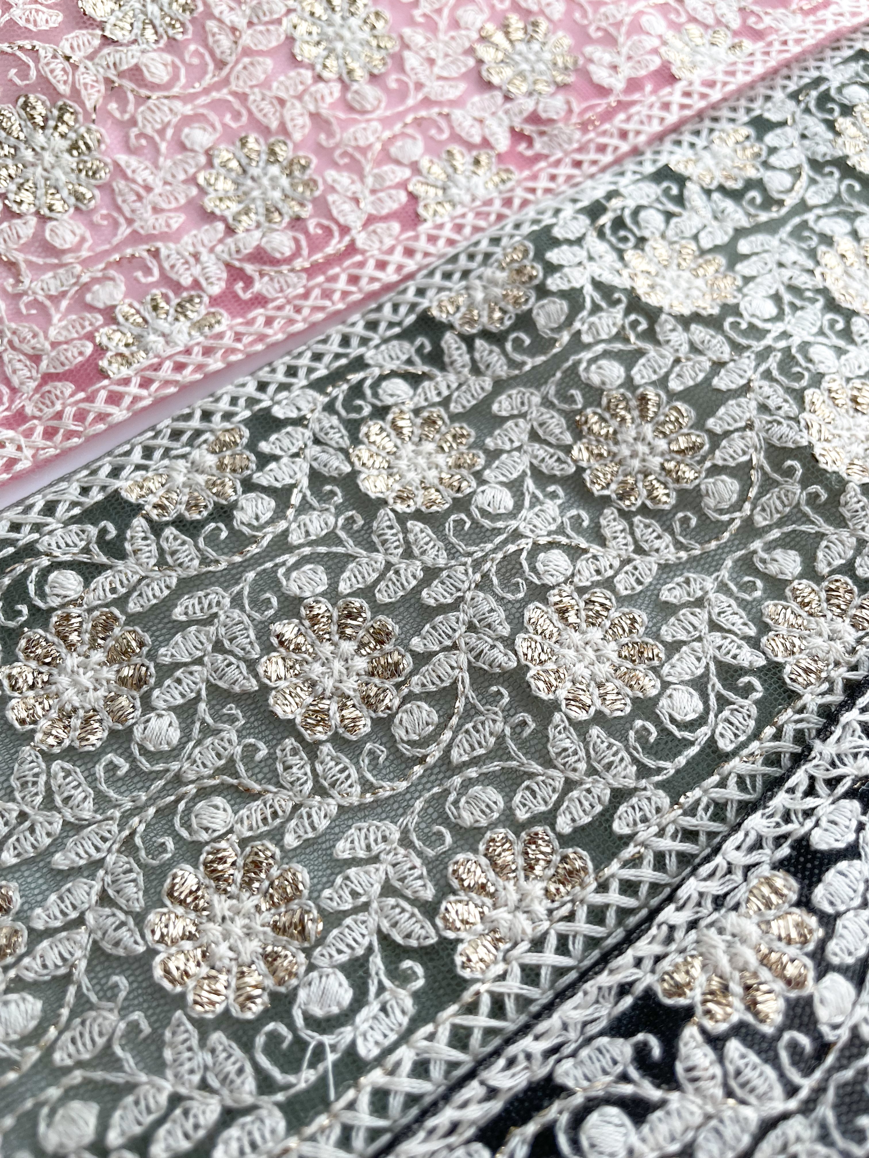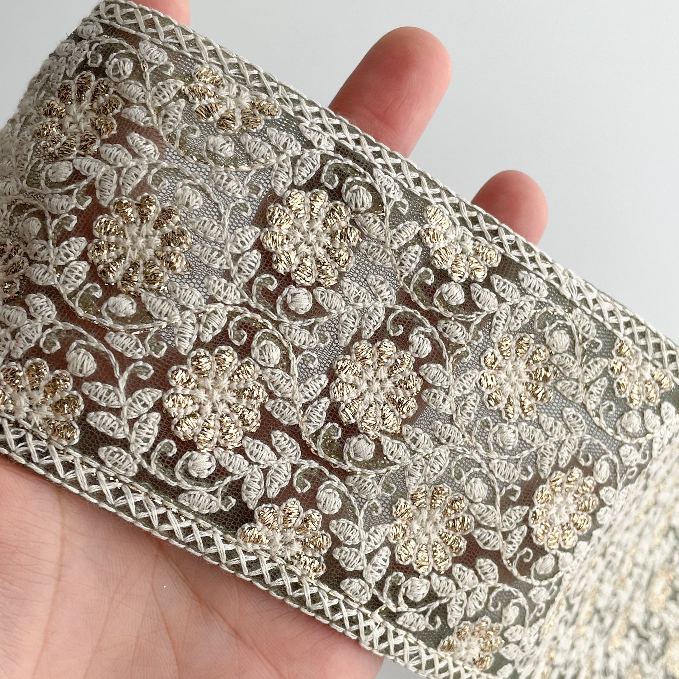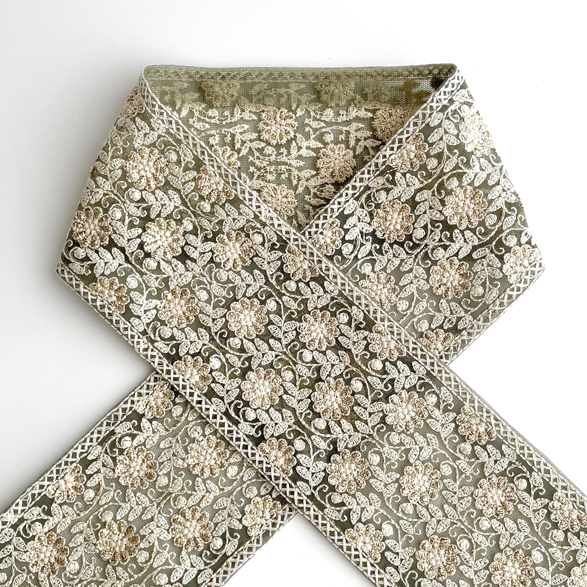 このような豪華な刺繍のリボンをインドでは「サリーボーダー」「アショカレース」と呼び、民族衣装サリーの裾を飾るのに使用しています。