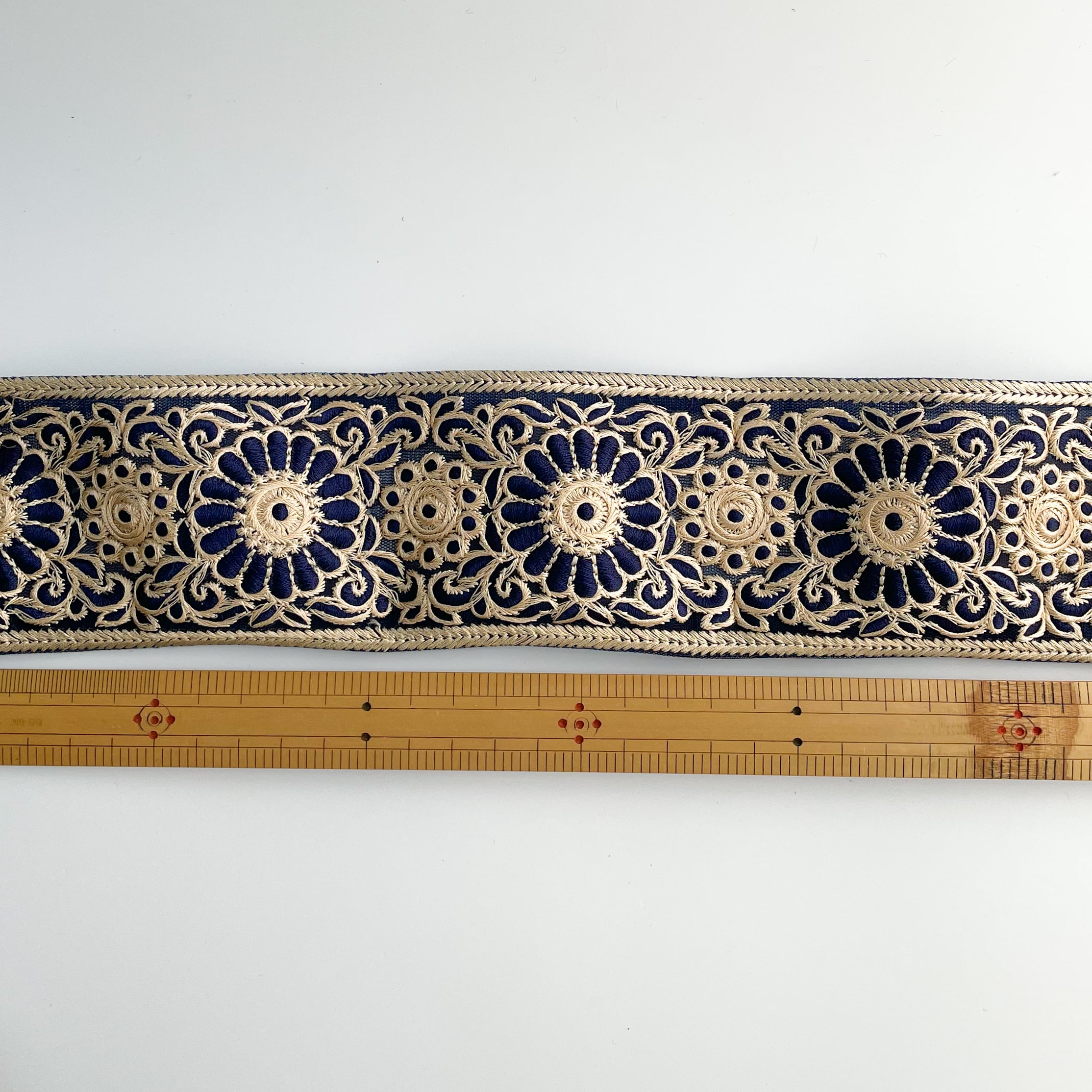 このような豪華な刺繍のリボンをインドでは「サリーボーダー」「アショカレース」と呼び、民族衣装サリーの裾を飾るのに使用しています。