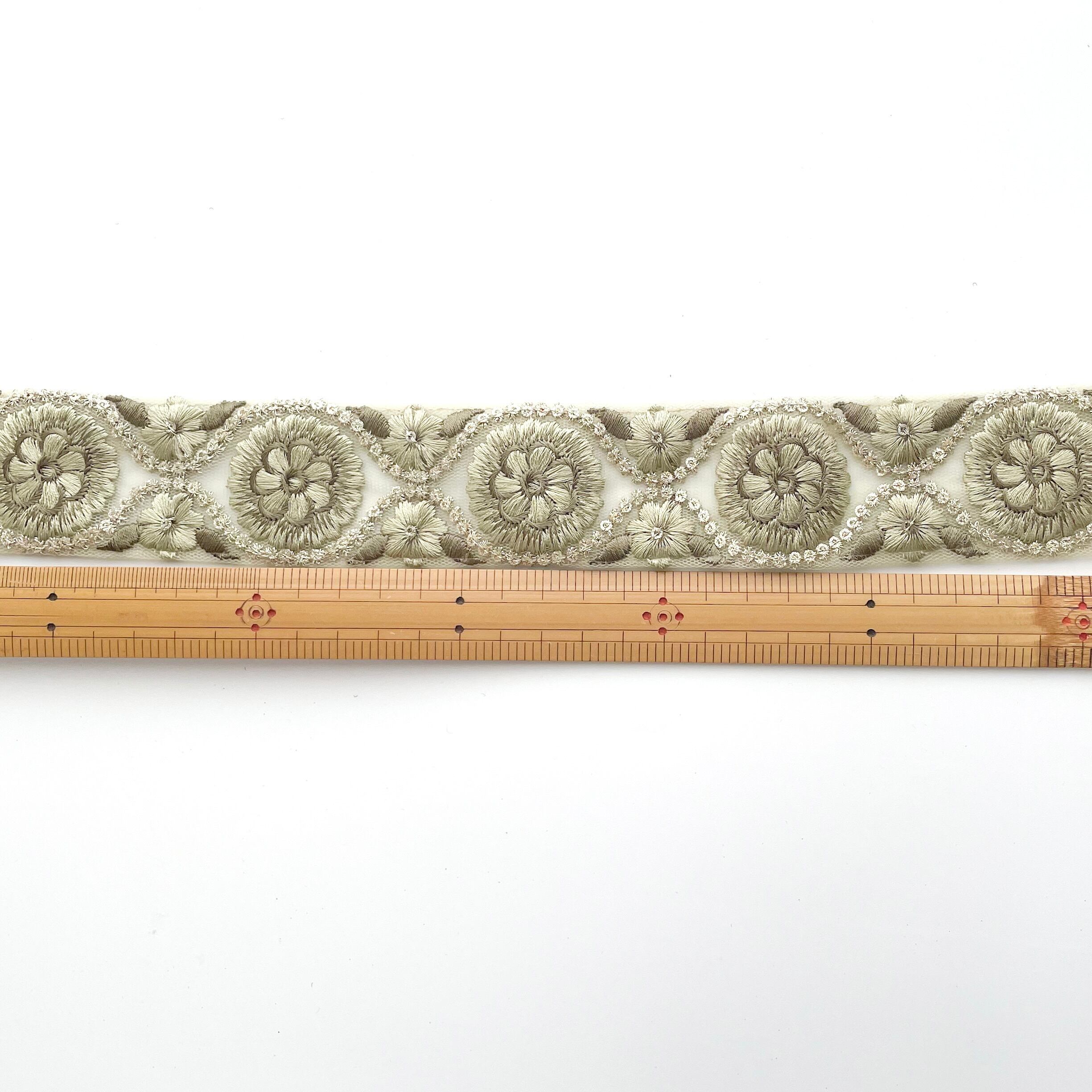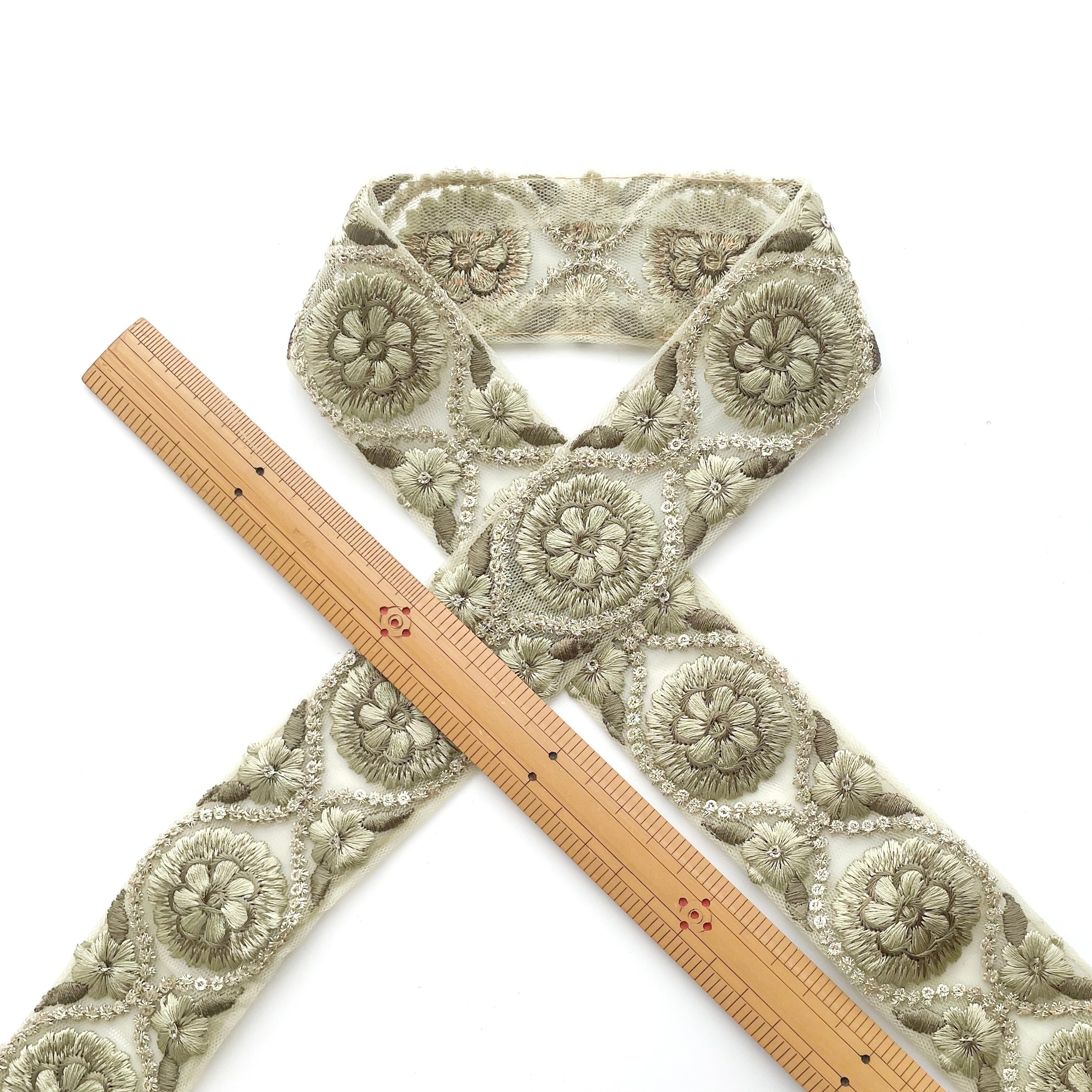 【50cmカット済】ins1081 大輪ウェーブスパンコール グリーン インド刺繍リボン