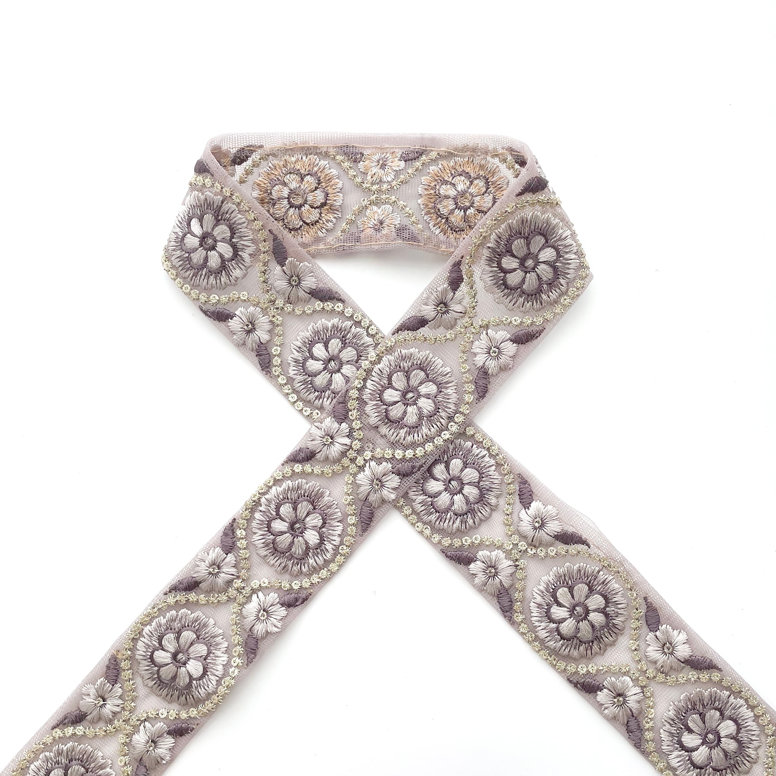 このような豪華な刺繍のリボンをインドでは「サリーボーダー」「アショカレース」と呼び、民族衣装サリーの裾を飾るのに使用しています。