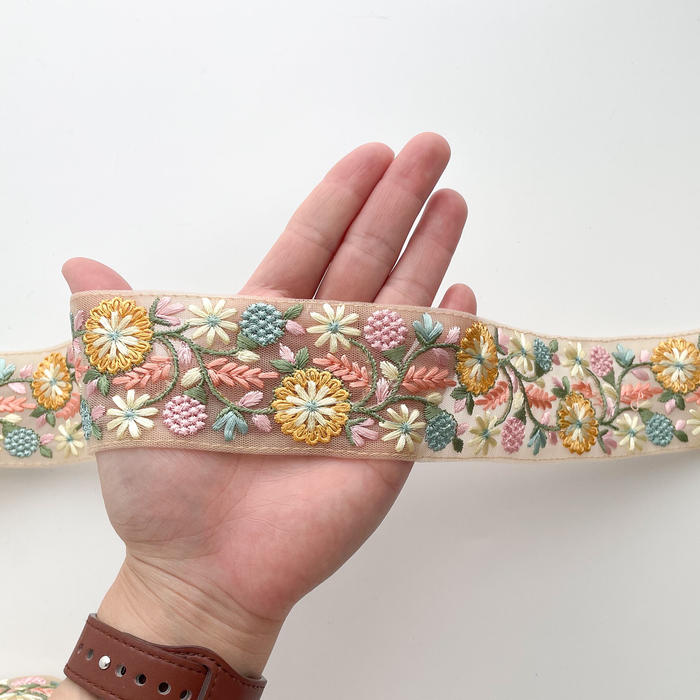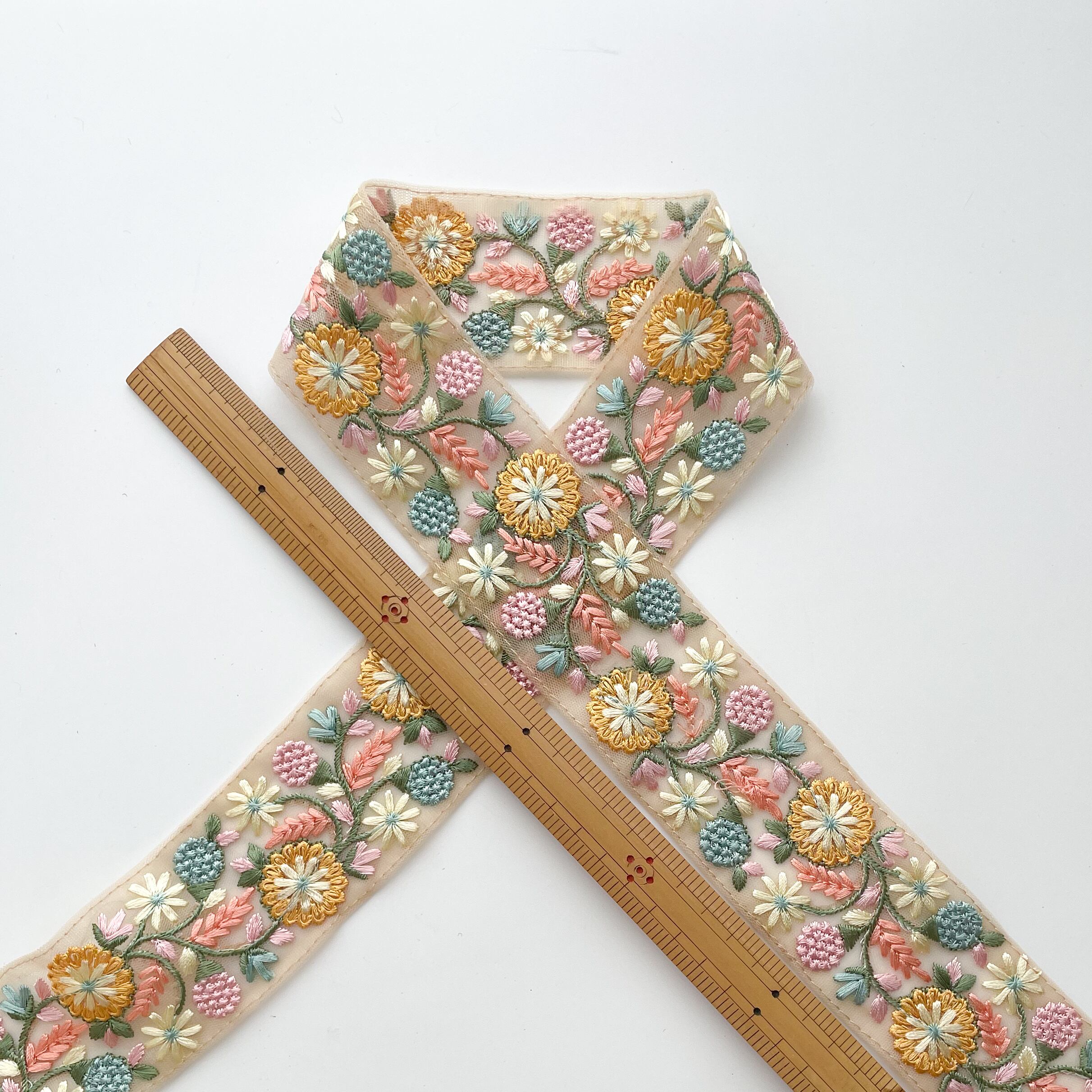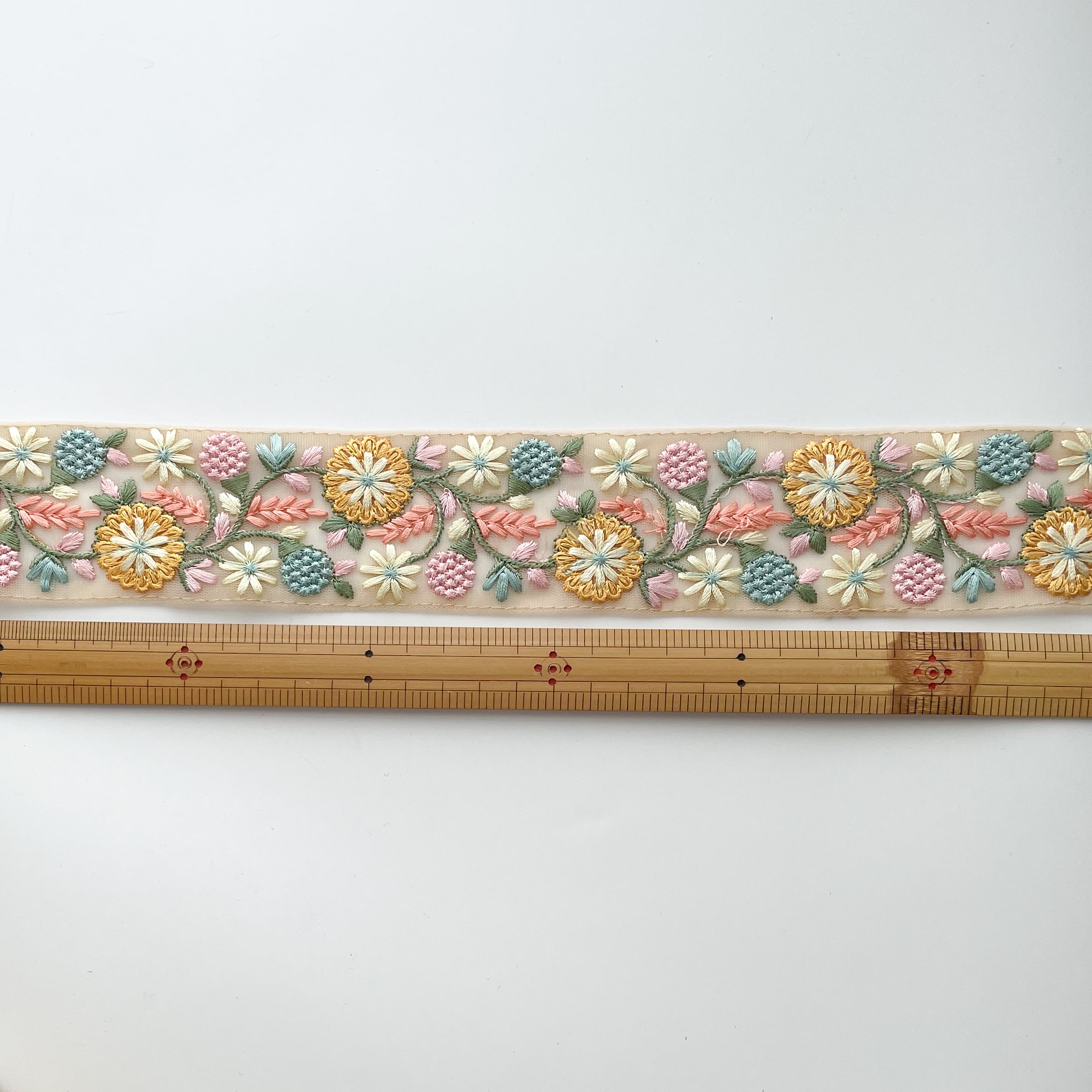 【50cmカット済み】ins1116 チュールパステルフラワー イエロー インド刺繍リボン
