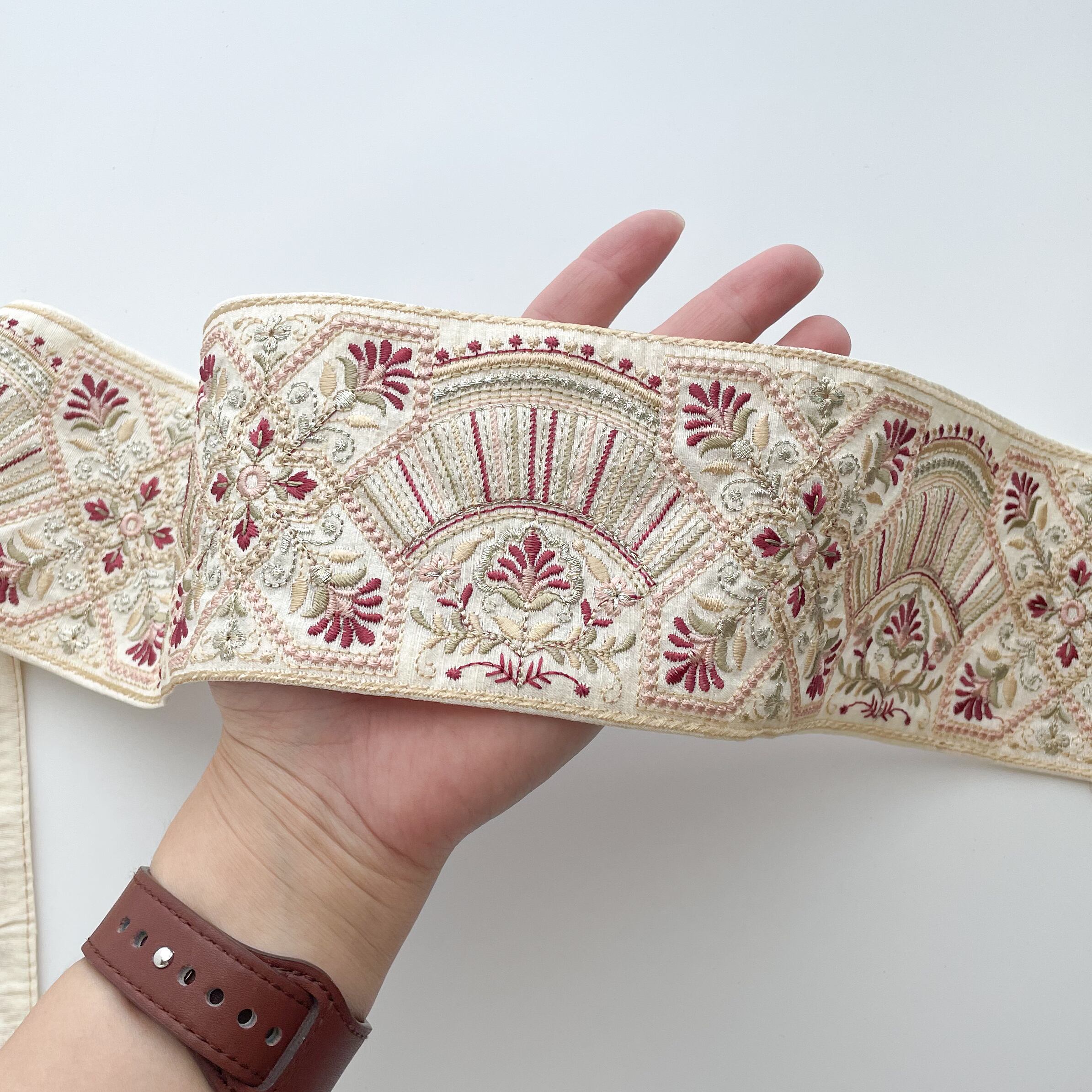 このような豪華な刺繍のリボンをインドでは「サリーボーダー」「アショカレース」と呼び、民族衣装サリーの裾を飾るのに使用しています。