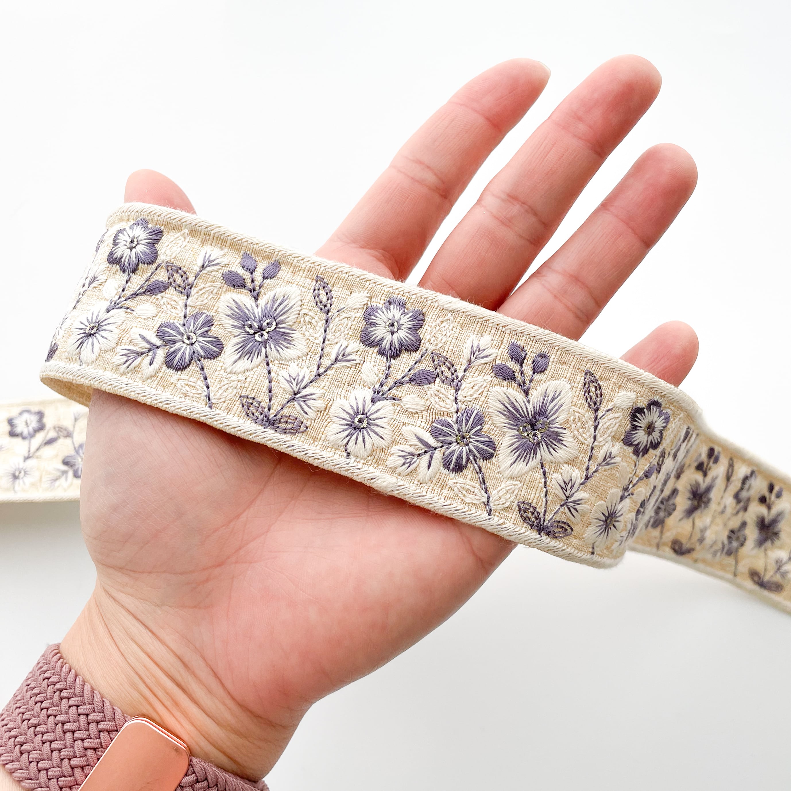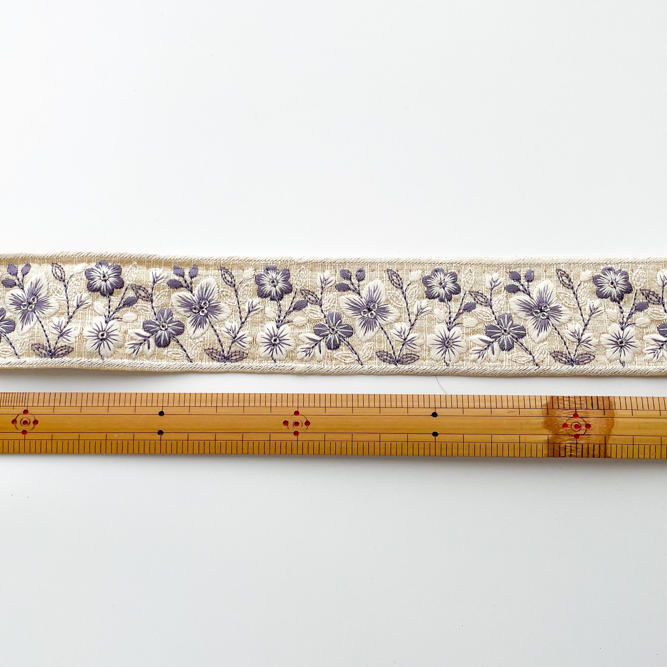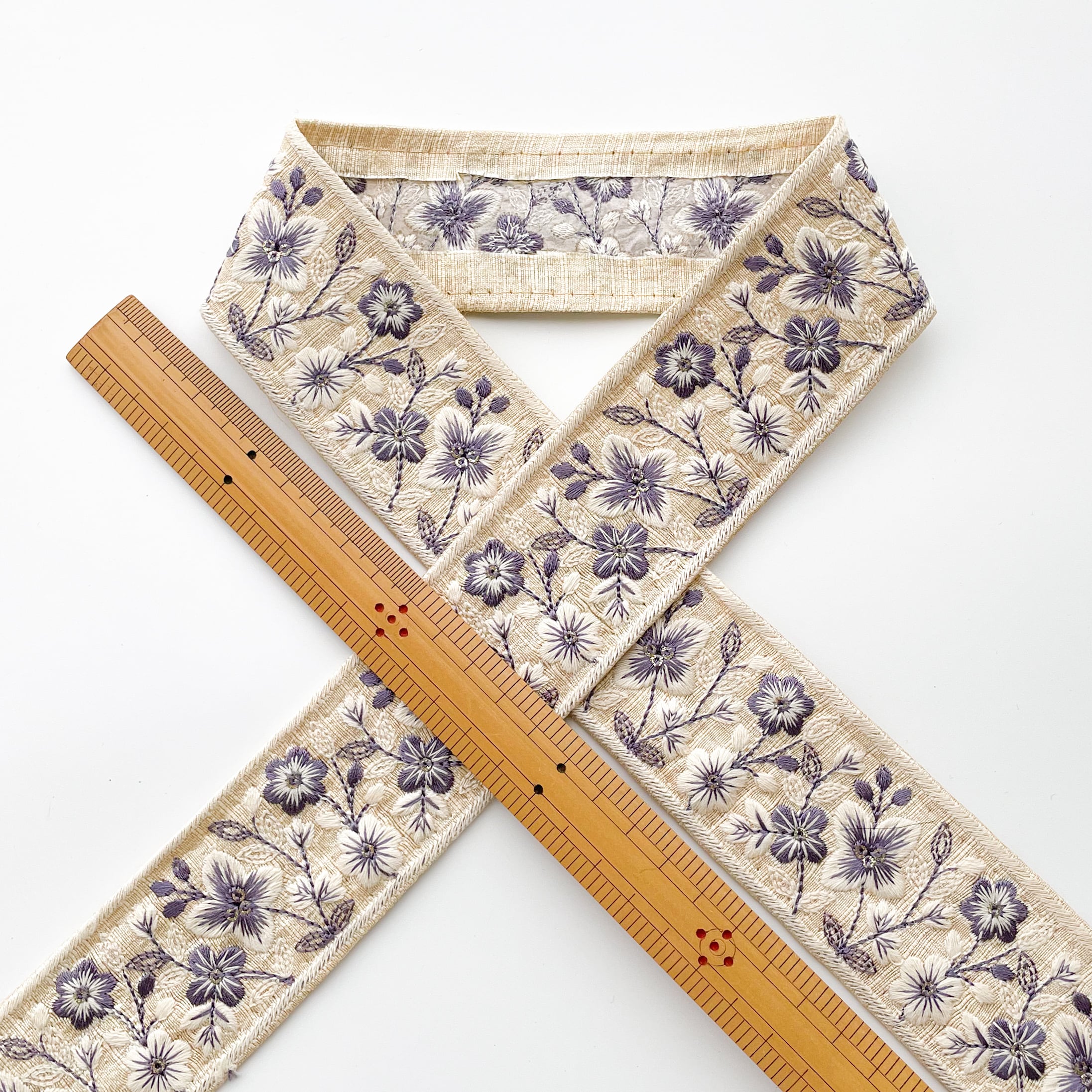 布地ベースにコットンの白色刺繍、同系色のツヤ感のある刺繍がほどこされた、布と質感を感じられる刺繍リボンです。