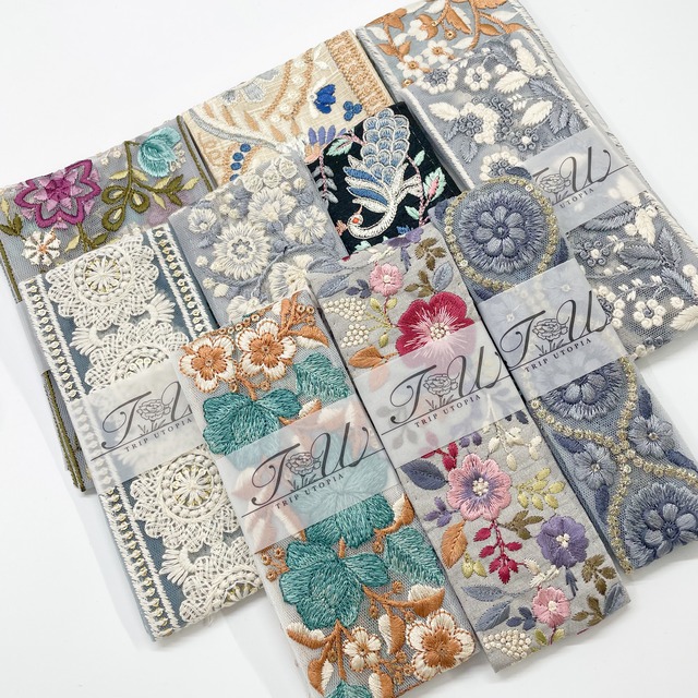 職人さんが一本一本丹精込めて手作りした、インドの刺繍リボンです。 このような豪華な刺繍のリボンをインドでは「サリーボーダー」「アショカレース」と呼び、民族衣装サリーの裾を飾るのに使用しています。 刺繍はミシンで行われていますが、布地のセットやカットなどの作業はインドの職人の手で行われています。そのためどうしてもリボンの幅などに若干の個体差が生じてしまいますことご了承ください。 チュール素地にふわふわの刺繍が入ったやわらかな質感の刺繍リボンです。 刺繍の部分は厚みがあり、盛り上がっています。 幅:約5cm 販売単位:50cm